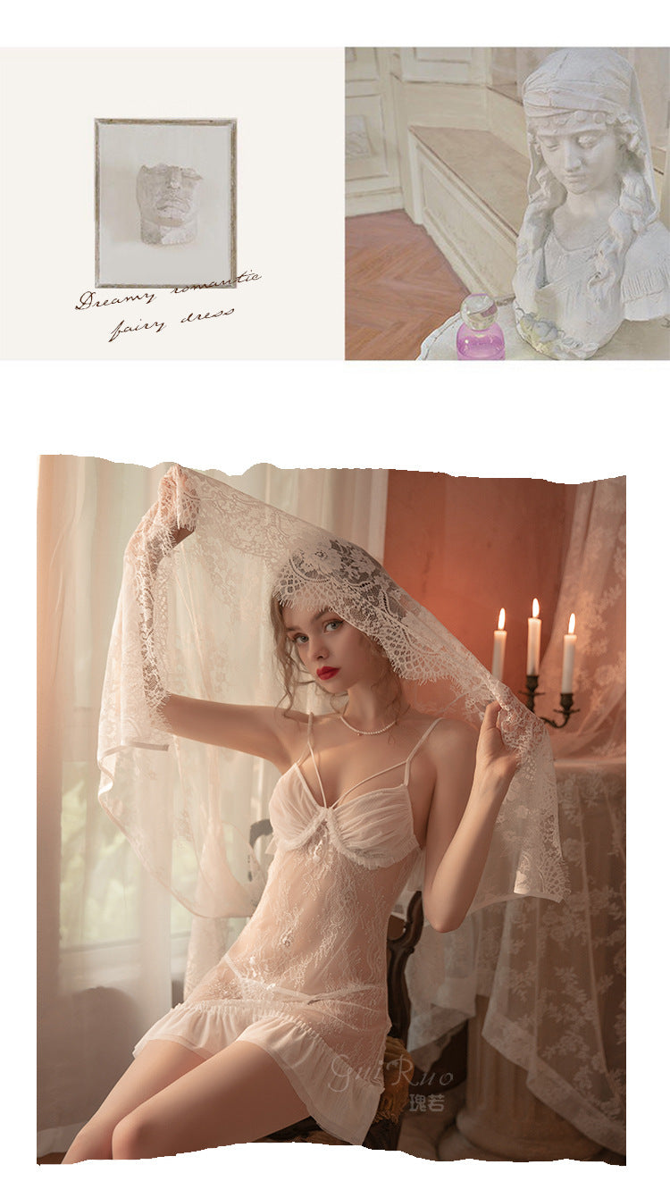 成人馆|春日絮语 深V加胸垫透视蕾丝纯欲睡裙 白色