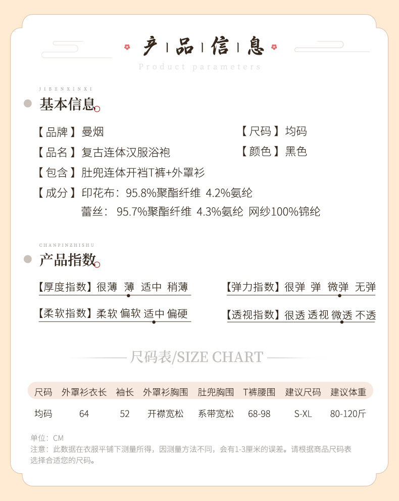 颜色:黑色,包含肚兜开档连体衣+外罩衫 尺码:均码,适合80-120斤