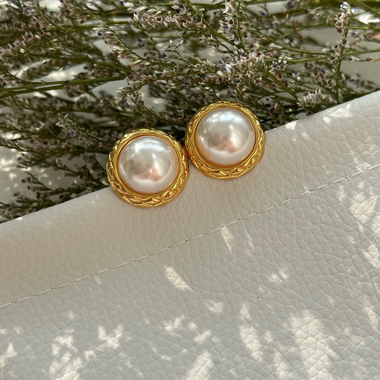 22% | 法式复古金属纽扣式大珍珠高级Vintage小香风优雅菱格耳钉