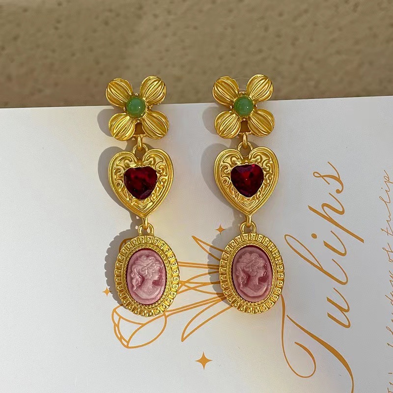 22%| S925银针中古气质金色长款花朵爱心复古法式宫廷风耳环耳饰