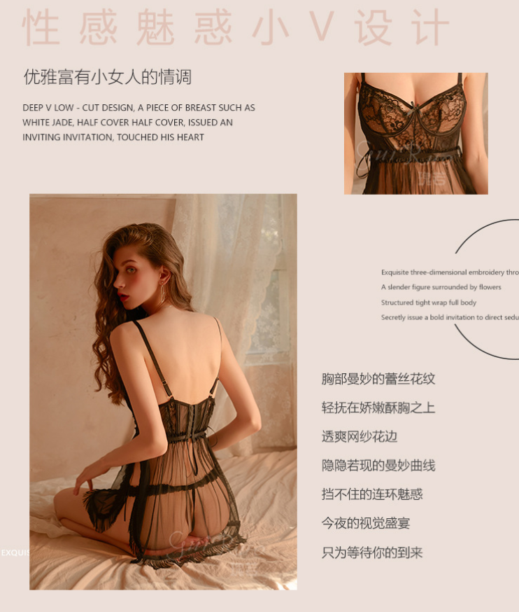 成人馆|网纱透视深V露背吊带睡裙