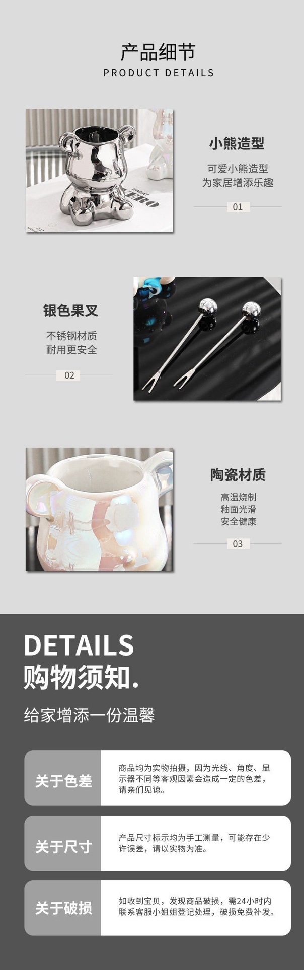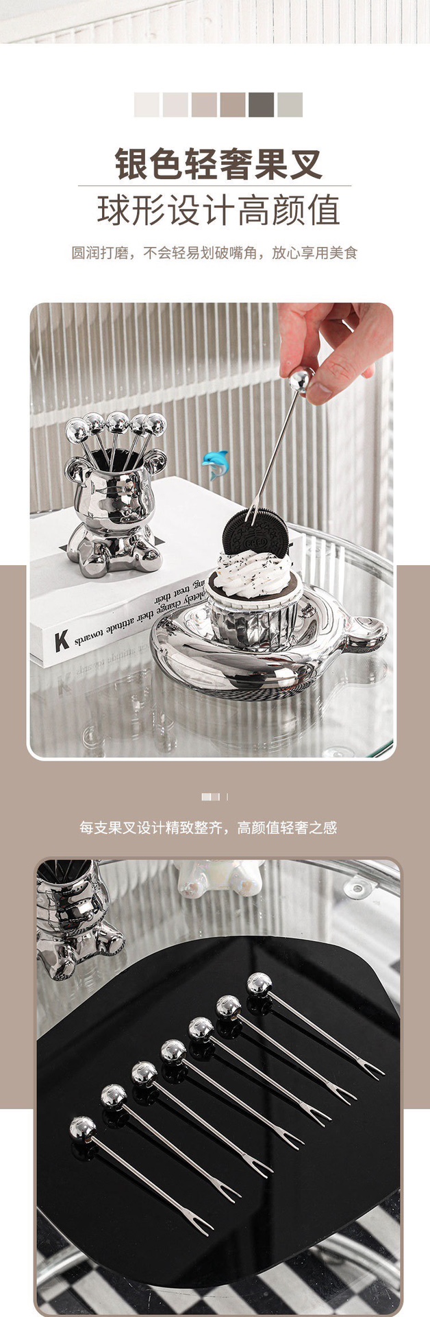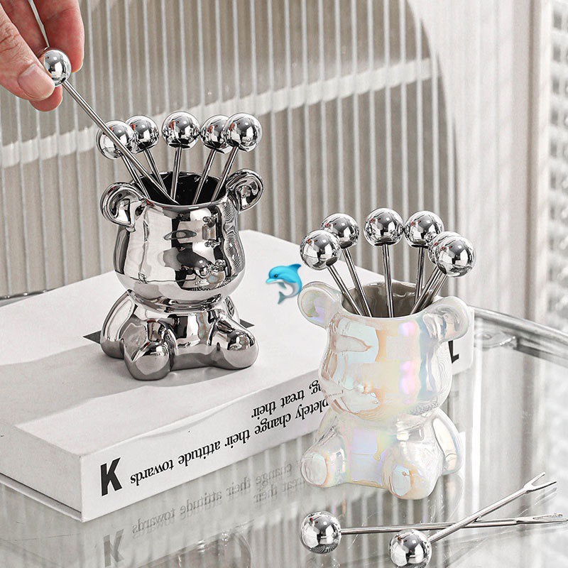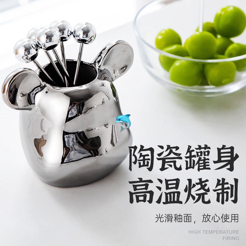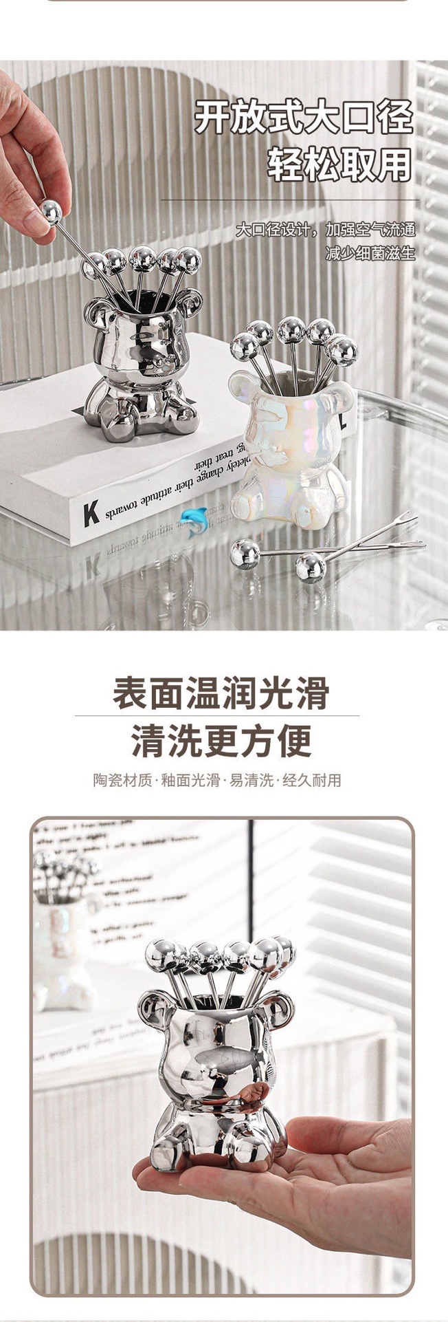 百货小铺|304不锈钢轻奢可爱创意小熊果叉罐 不锈钢叉6支➕陶瓷收纳罐一个