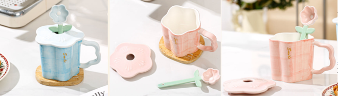 优品【杯+盖+勺】立体花朵陶瓷马克杯480ml 两款选