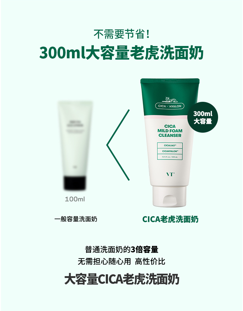 优品|韩国 VT CICA老虎洗面奶积雪草镇静肌肤清洁温和 300ml