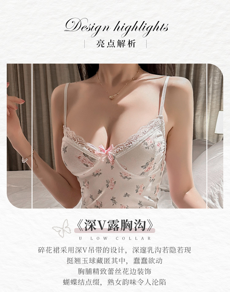 成人馆|茶艺千金 甜美小碎花蕾丝低胸包臀吊带睡裙