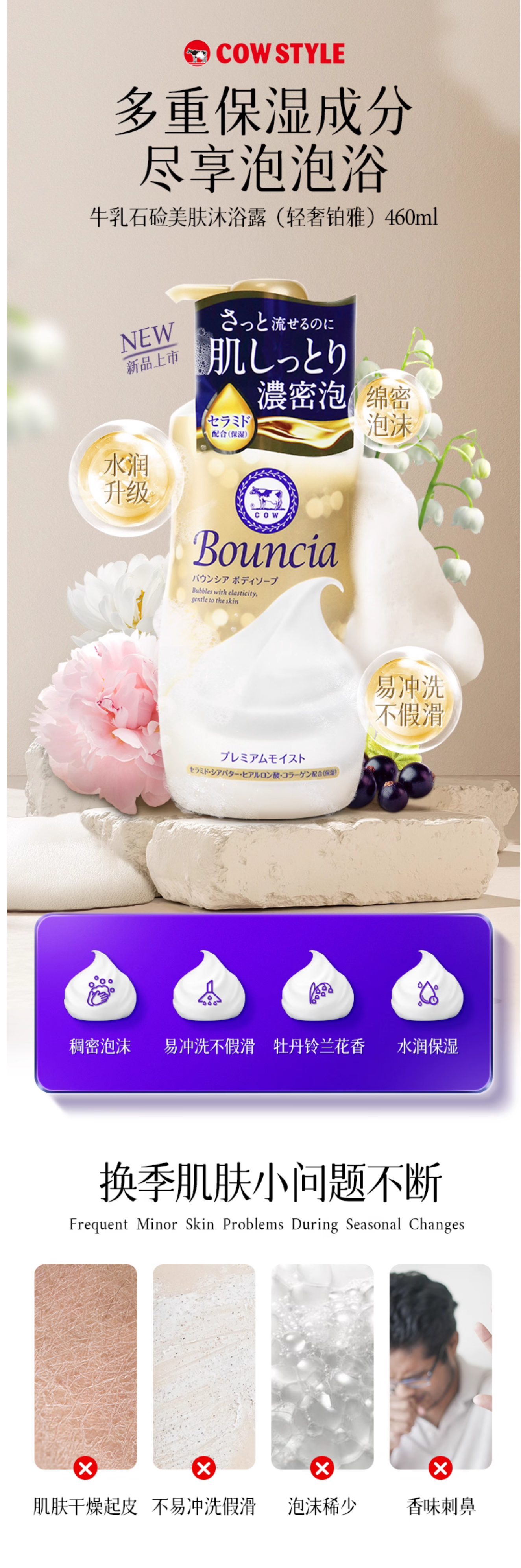 日本 BOUNCIA 牛乳石鹸泡沫沐浴露 金色奢华牛乳 铃兰花香460ml